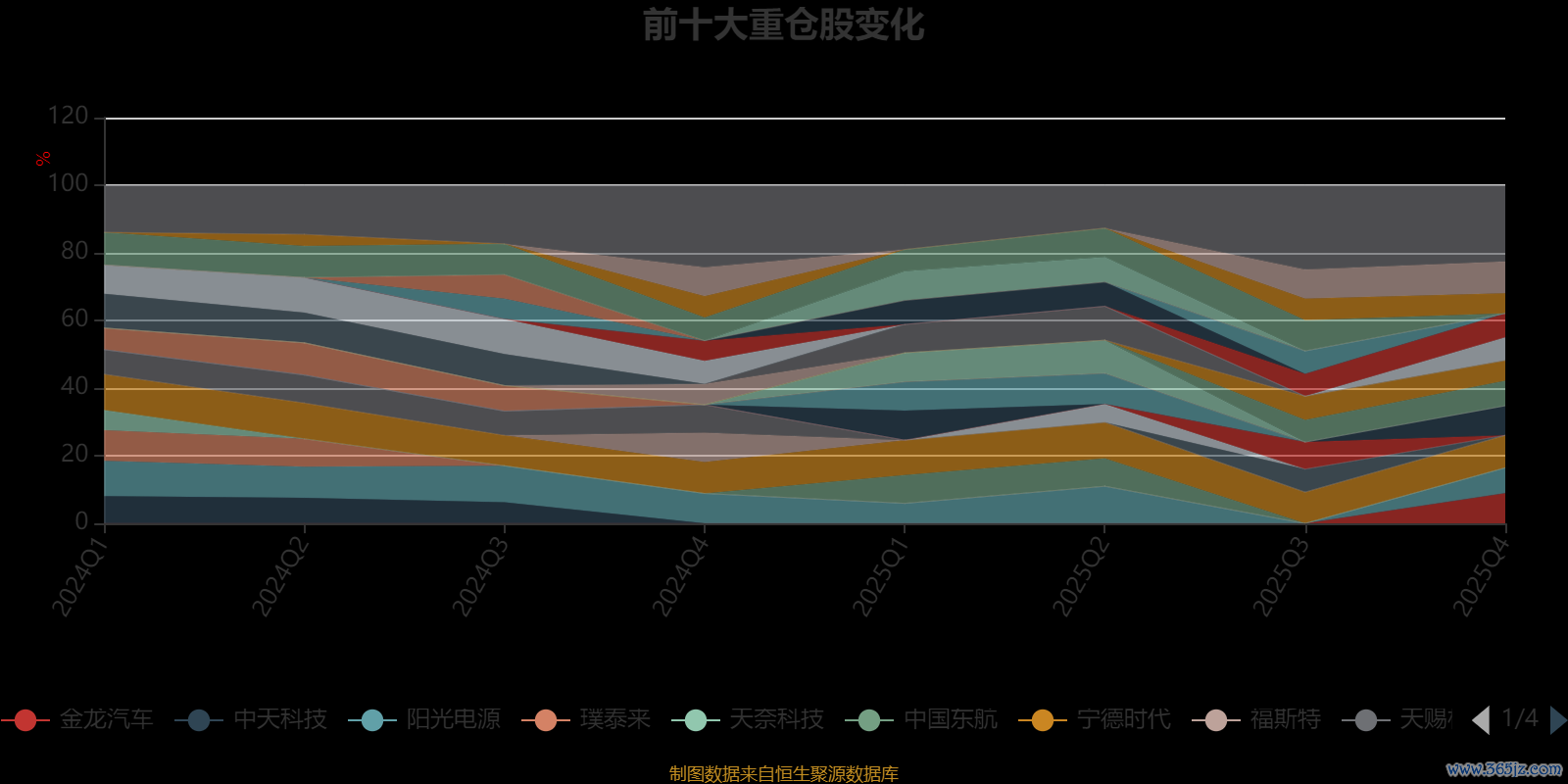 该基金持股集中度较高,近2年前十大重仓股集中度长期超过60%。截至2025年四季度末,基金十大重仓股分别是宁德时代、通威股份、金龙汽车、欣旺达、阳光电源、晶科能源、天合光能、亿纬锂能、阿特斯、晶澳科技。